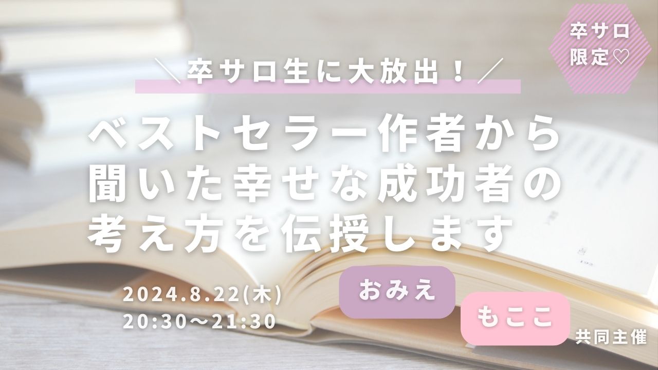 ワークショップ卒サロ生に大放出!ベストセラー作者から聞いた幸せな成功者の考え方を伝授します Pri-me 2024年8月22日 ・本サイトはサロン会員の方のみお楽しみいただけます ・卒サロ生はメニューよりログインしてください ・新規ご入会希望の方は事務局までお問い合わせください。LLA卒業生の方のみご入会可能です。 →お問い合わせはこちら おみえ もここ
