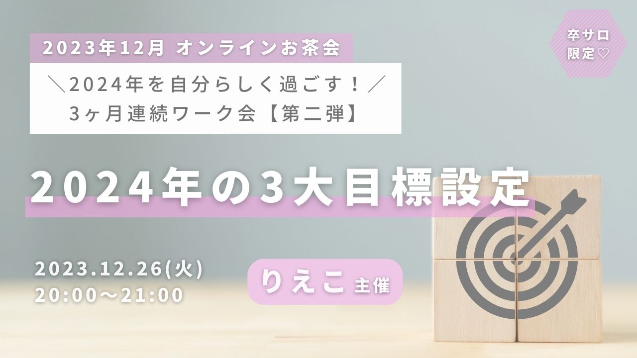 ワークショップ2024年を自分らしく過ごす!3か月連続ワーク会 第二弾「2024年の3大目標設定」 Pri-me 2023年12月26日 ・本サイトはサロン会員の方のみお楽しみいただけます ・卒サロ生はメニューよりログインしてください ・新規ご入会希望の方は事務局までお問い合わせください。LLA卒業生の方のみご入会可能です。 →お問い合わせはこちら