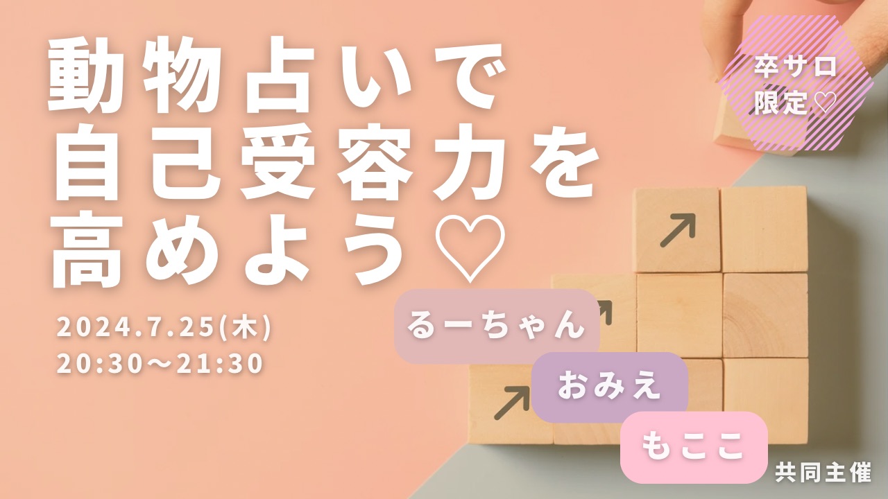 ワークショップ動物占いで自己受容力を高めよう♡ Pri-me 2024年7月25日 ・本サイトはサロン会員の方のみお楽しみいただけます ・卒サロ生はメニューよりログインしてください ・新規ご入会希望の方は事務局までお問い合わせください。LLA卒業生の方のみご入会可能です。 →お問い合わせはこちら おみえ もここ るーちゃん