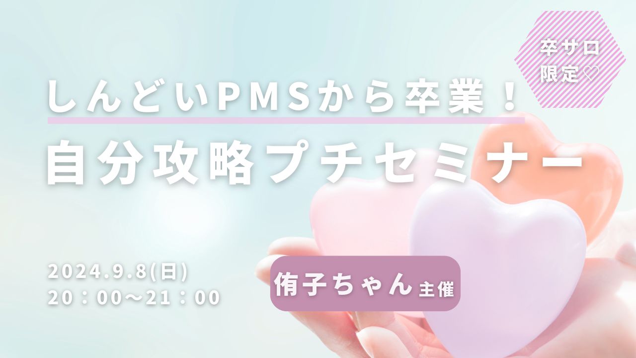 ワークショップしんどいPMSから卒業!自分攻略プチセミナー Pri-me 2024年9月8日 ・本サイトはサロン会員の方のみお楽しみいただけます ・卒サロ生はメニューよりログインしてください ・新規ご入会希望の方は事務局までお問い合わせください。LLA卒業生の方のみご入会可能です。 →お問い合わせはこちら 侑子ちゃん