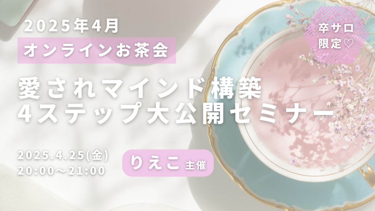 無料セミナー愛されマインド構築4ステップ大公開セミナー uenoriekostaff 2025年4月25日 ・本サイトはサロン会員の方のみお楽しみいただけます ・卒サロ生はメニューよりログインしてください ・新規ご入会希望の方は事務局までお問い合わせください。LLA卒業生の方のみご入会可能です。 →お問い合わせはこちら