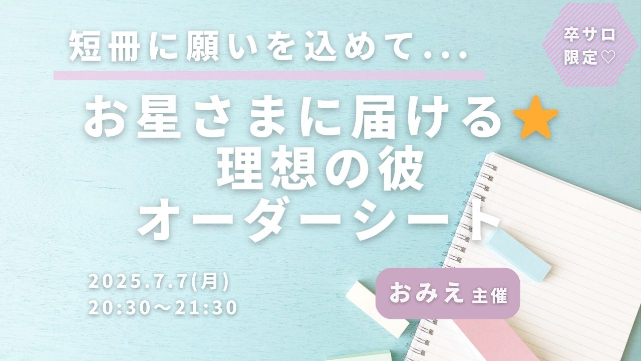 ワークショップ短冊に願いを込めて… お星さまに届ける⭐︎理想の彼オーダーシート uenoriekostaff 2025年7月7日 ・本サイトはサロン会員の方のみお楽しみいただけます ・卒サロ生はメニューよりログインしてください ・新規ご入会希望の方は事務局までお問い合わせください。LLA卒業生の方のみご入会可能です。 →お問い合わせはこちら おみえ