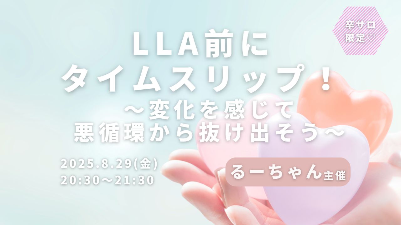 ワークショップLLA前にタイムスリップ!〜変化を感じて悪循環から抜け出そう〜 uenoriekostaff 2025年8月29日 ・本サイトはサロン会員の方のみお楽しみいただけます ・卒サロ生はメニューよりログインしてください ・新規ご入会希望の方は事務局までお問い合わせください。LLA卒業生の方のみご入会可能です。 →お問い合わせはこちら るーちゃん