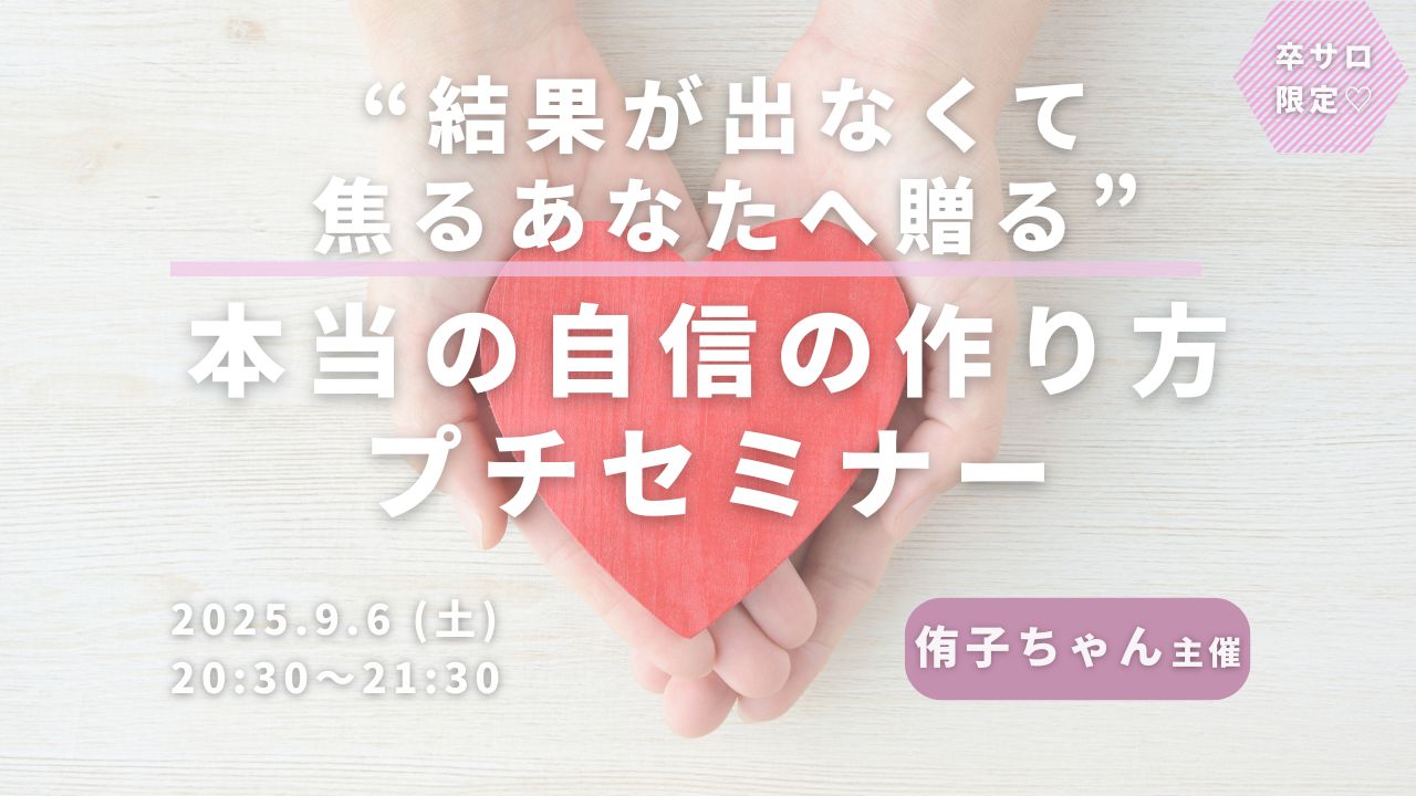 ワークショップ“結果が出なくて焦るあなたへ贈る” 本当の自信の作り方プチセミナー uenoriekostaff 2025年9月6日 ・本サイトはサロン会員の方のみお楽しみいただけます ・卒サロ生はメニューよりログインしてください ・新規ご入会希望の方は事務局までお問い合わせください。LLA卒業生の方のみご入会可能です。 →お問い合わせはこちら 侑子ちゃん