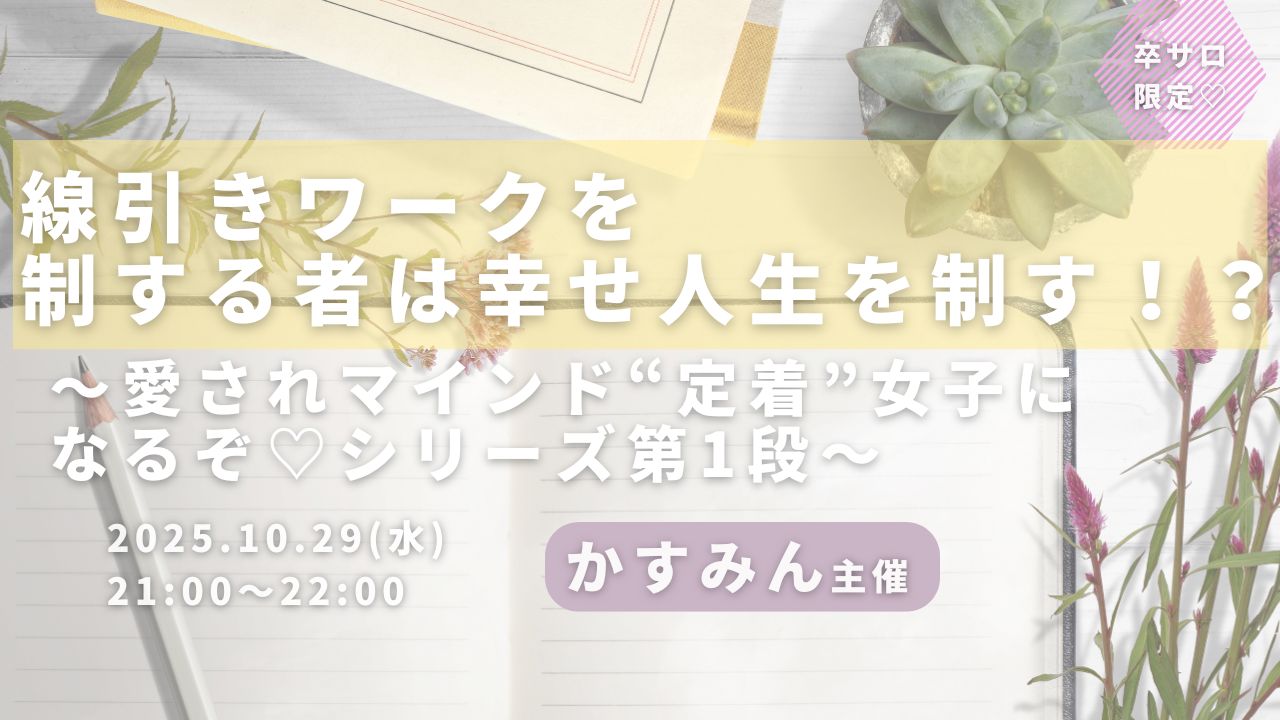 ワークショップ線引きワークを制する者は幸せ人生を制す!? ~愛されマインド”定着“女子になるぞ♡シリーズ第1段~ uenoriekostaff 2025年10月29日 ・本サイトはサロン会員の方のみお楽しみいただけます ・卒サロ生はメニューよりログインしてください ・新規ご入会希望の方は事務局までお問い合わせください。LLA卒業生の方のみご入会可能です。 →お問い合わせはこちら かすみん