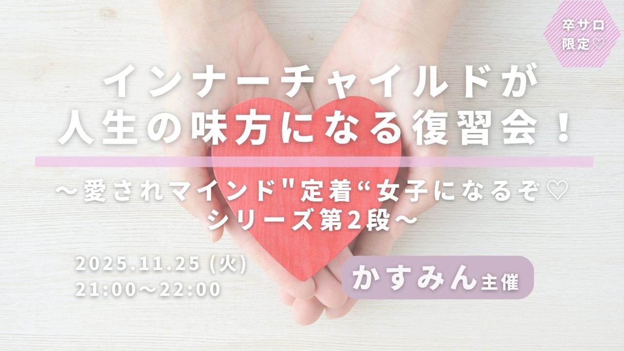 ワークショップインナーチャイルドが人生の味方になる復習会!~愛されマインド”定着“女子になるぞ♡シリーズ第2段~ uenoriekostaff 2025年11月25日 ・本サイトはサロン会員の方のみお楽しみいただけます ・卒サロ生はメニューよりログインしてください ・新規ご入会希望の方は事務局までお問い合わせください。LLA卒業生の方のみご入会可能です。 →お問い合わせはこちら かすみん