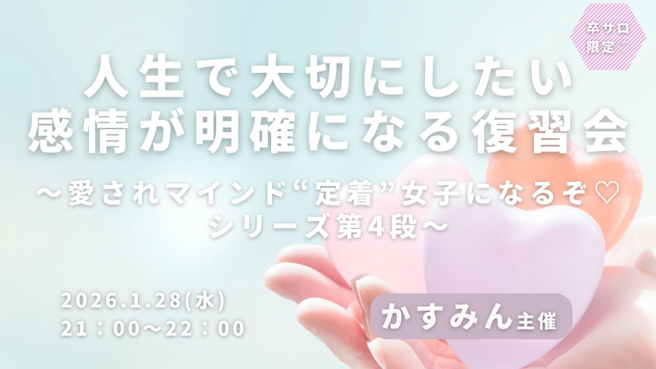 ワークショップ人生で大切にしたい感情が明確になる復習会 ~愛されマインド”定着“女子になるぞ♡シリーズ第4段~ uenoriekostaff 2026年1月28日 ・本サイトはサロン会員の方のみお楽しみいただけます ・卒サロ生はメニューよりログインしてください ・新規ご入会希望の方は事務局までお問い合わせください。LLA卒業生の方のみご入会可能です。 →お問い合わせはこちら かすみん