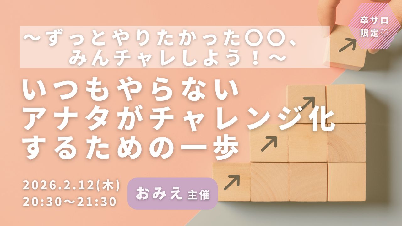 ワークショップ〜ずっとやりたかった〇〇、みんチャレしよう!〜 いつもやらないアナタがチャレンジ化するための一歩 uenoriekostaff 2026年2月12日 ・本サイトはサロン会員の方のみお楽しみいただけます ・卒サロ生はメニューよりログインしてください ・新規ご入会希望の方は事務局までお問い合わせください。LLA卒業生の方のみご入会可能です。 →お問い合わせはこちら おみえ