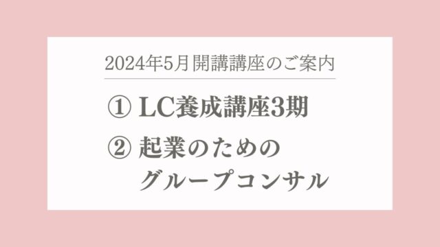 お知らせLC養成講座3期&起業のためのグループコンサル 2024年3月1日 Pri-me https://uenorieko.com/online_salon/wp-content/uploads/2023/07/salon_logo2.jpg LLA卒業生限定オンラインサロン♡